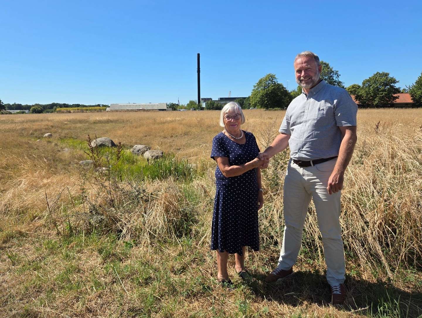 Formand Lis Schou fra DVB Parkens lokale bestyrelse på Bornholm og borgmester Jacob Trøst ved den grund på Paradisvej i Rønne, hvor de kommende familieboliger skal ligge. Pressefoto