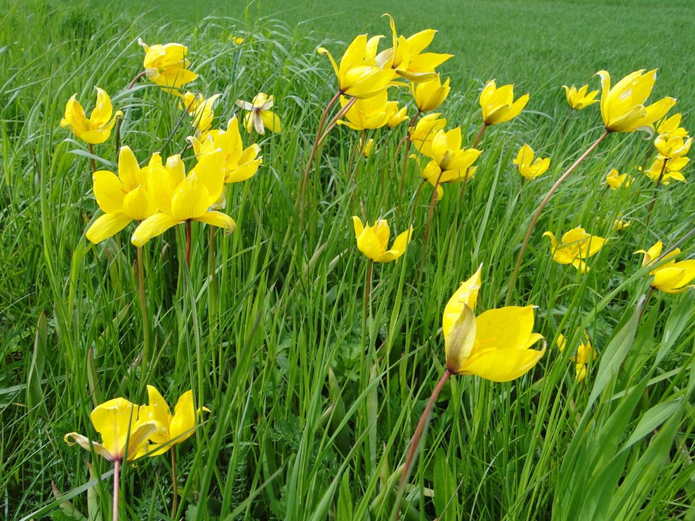 Grøftekanternes vilde gule tulipaner er en bornholmsk specialitet og vokser alle steder. De er mere sjældne i det øvrige land. I slutningen af maj inddeles øens marker i gule firkanter når rapsen blomstrer.