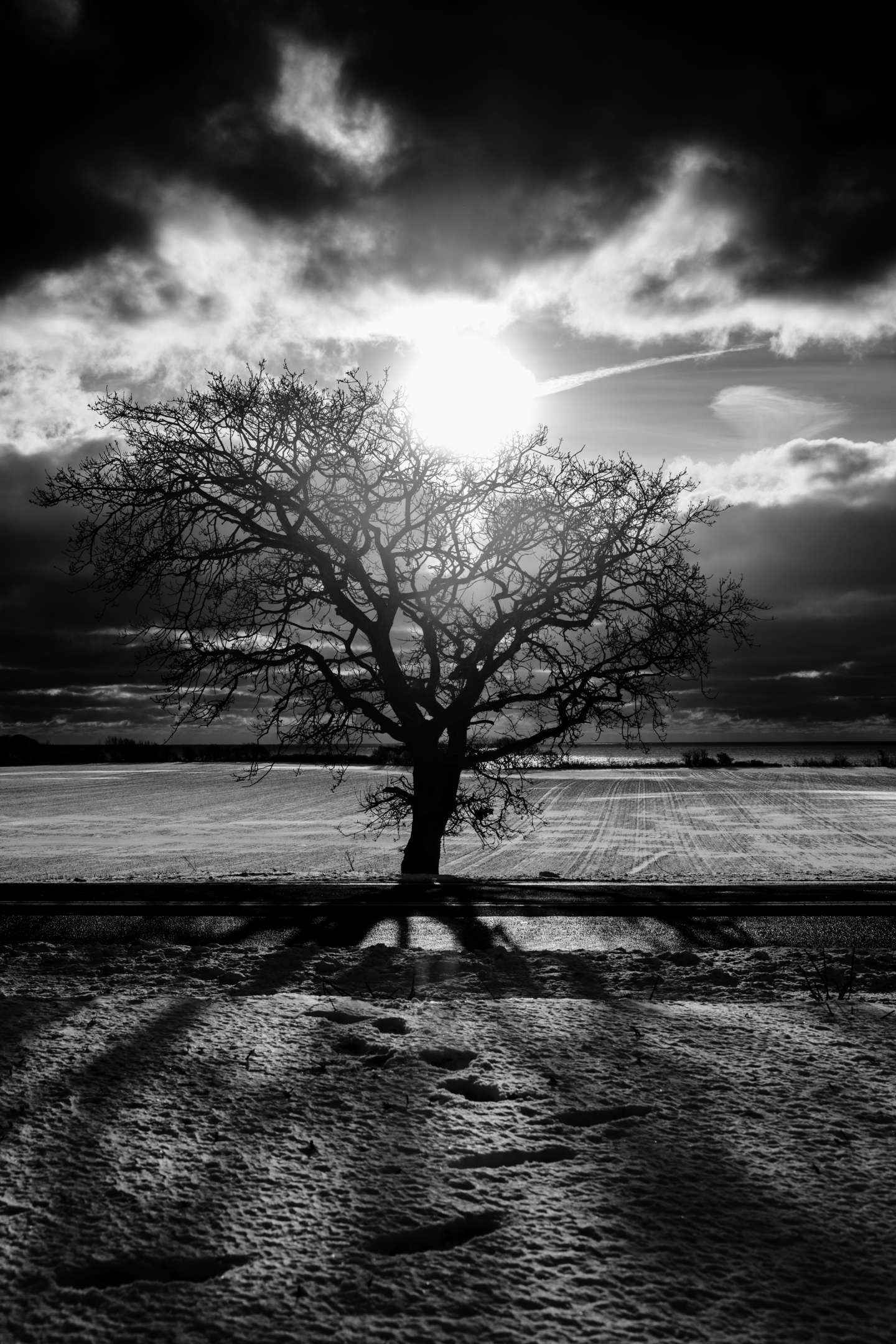 Et ensomt træ - kun i selskab af solen, jeg selv og mine spor i sneen. Foto: Mikkel Lauridsen...