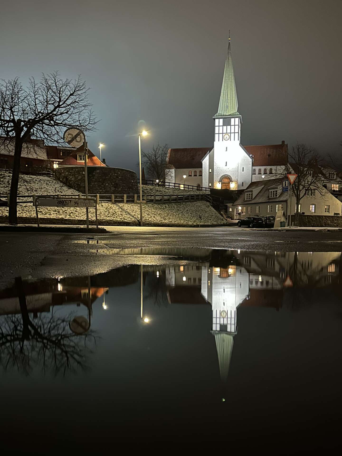 Dagens billede: Kirken i Rønne med spejlbillede i en vandpyt