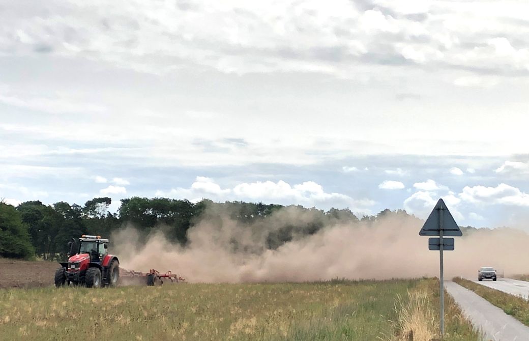 Landmand pløjer planter ned her på Søndre landevej over for landingsbanen på Bornholms Lufthavn. Jorden er tør, lader det til. Foto: Torben Østergaard Møller.