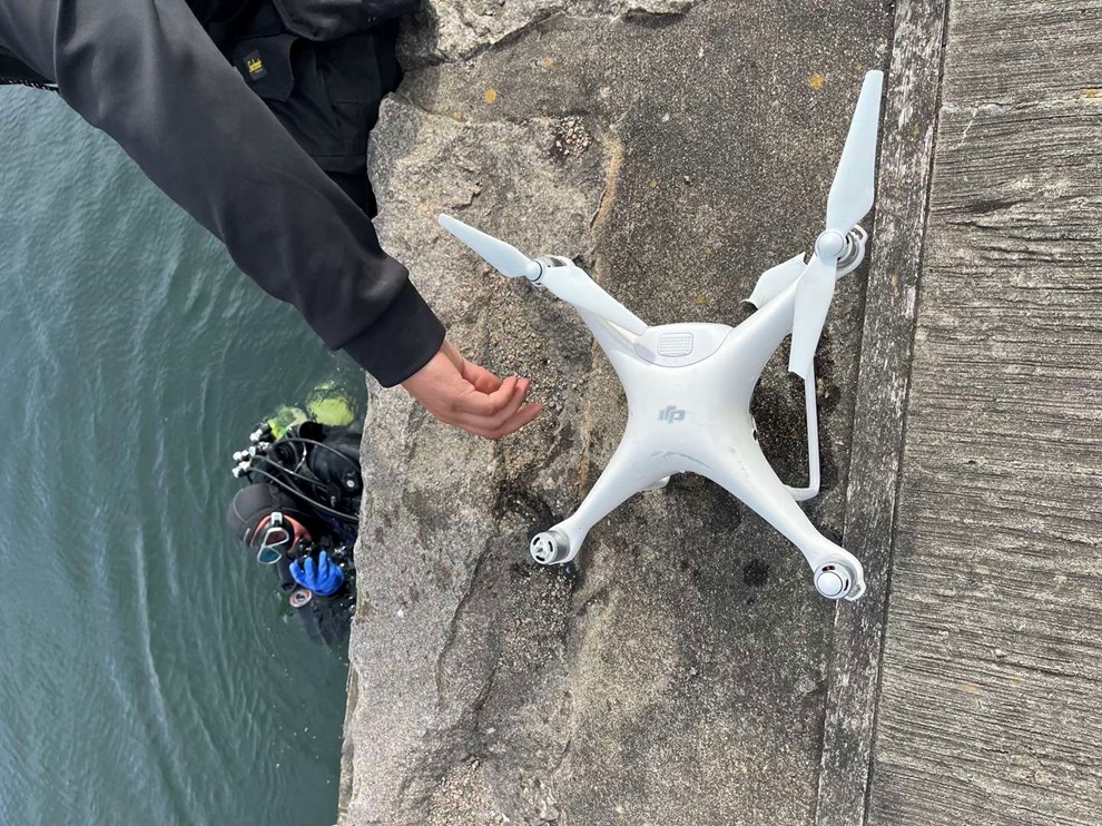 Det tog en lokal dykker 30 sekunder at finde dronen på fire meter vand.