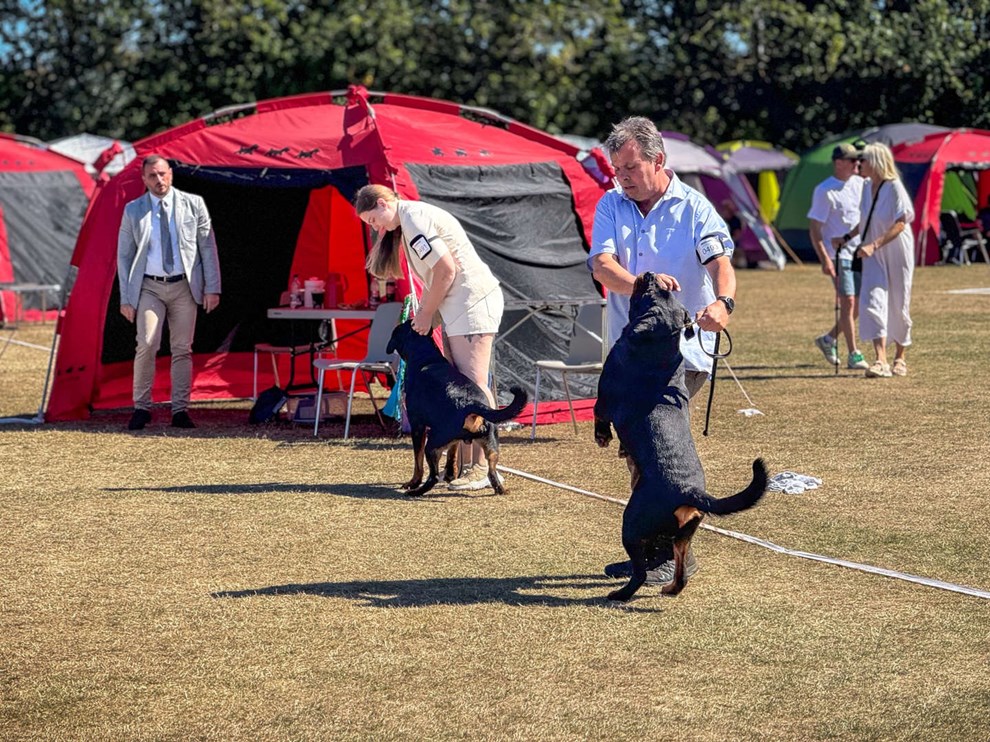 Hundeudstillingen foregik fredag, lørdag og søndag, og på de tre dage har der i alt været 5.000 hunde, som blev bedømt på fodboldbanerne ved Rønne Stadion Nord. Foto: Jesper Gynther