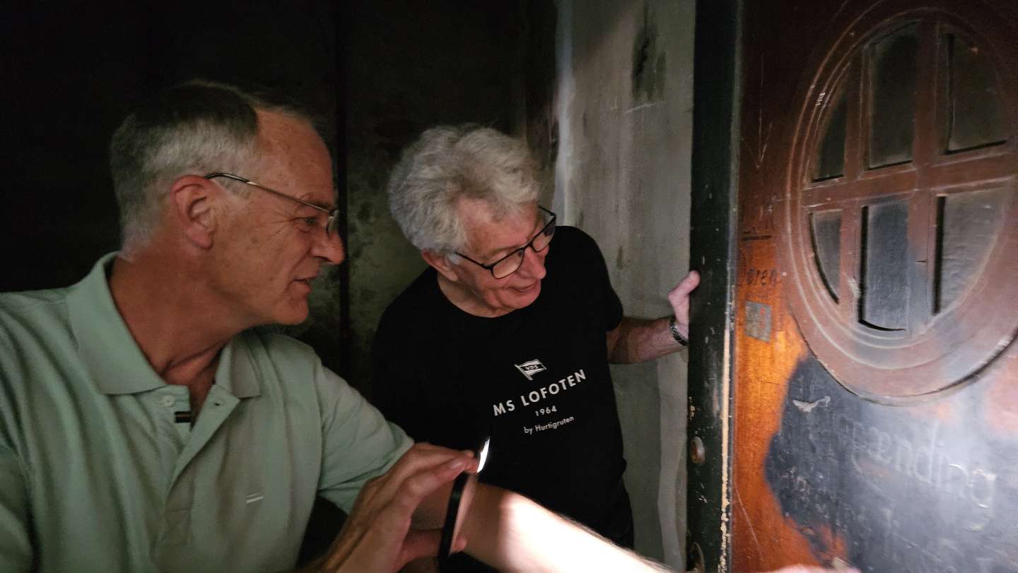 Anders Brüel til venstre og Knudaage Olesen kigger fascinerede på inskriptionen og de mange detaljer. Der står, det er livsfarligt. Foto: Søren Strandman-Møller