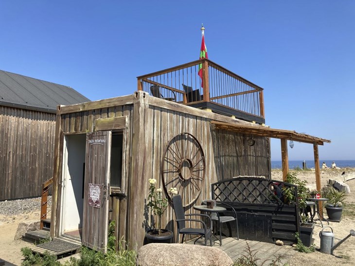 En ting, der går igen ved Dåsen er det bornholmske flag, der både flagrer i den stille brise på tagterrassen og er malet på papircontaineren, der i Dåsen fungerer som pantsamler.