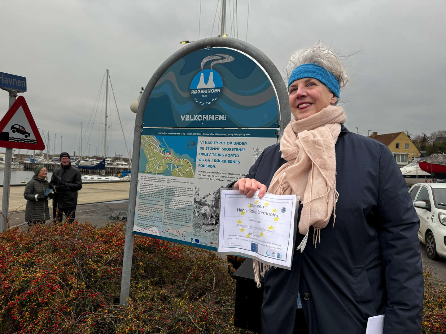 Hanne Stange Bremholm fik et diplom for arbejdet med at skabe Røgerinoen i Tejn. Her er hun ved rutens start på Beddingsvej på Tejn Havn. Foto: Holger Larsen
