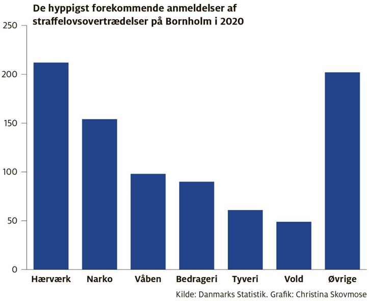 Her er bedrageri, tyveri og vold de typer af lovovertrædelser, som hyppigst anmeldes, men ikke i et antal, der får Bornholm til at skille sig ud i statistikken.