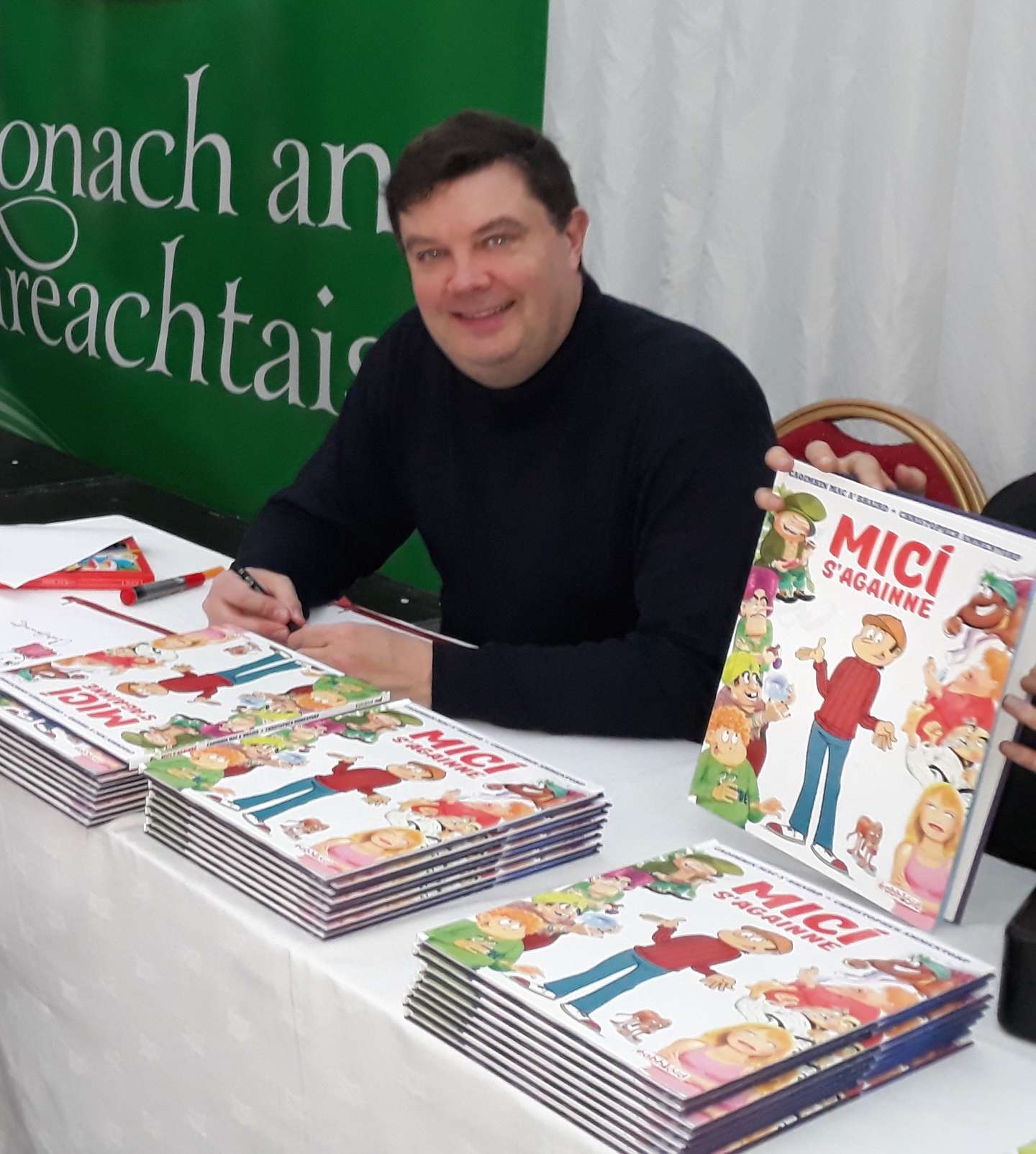 Første gang Christopher Ammentorp skabte en tegneserie med lokalt særpræg, foregik det på Irlands oprindelige sprog. Her ses han, da serien "Micí s'againne" blev lanceret på den irske kulturfestival "Oireachtas na Gaeilge" i byen Killarney. Albummet modtog siden en sølvmedalje ved en prisuddeling for børnebøger i Dublin i november 2019. Privatfoto