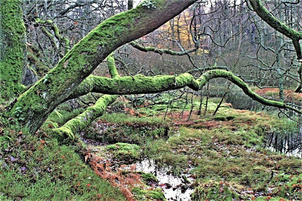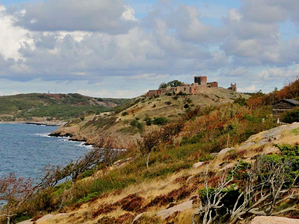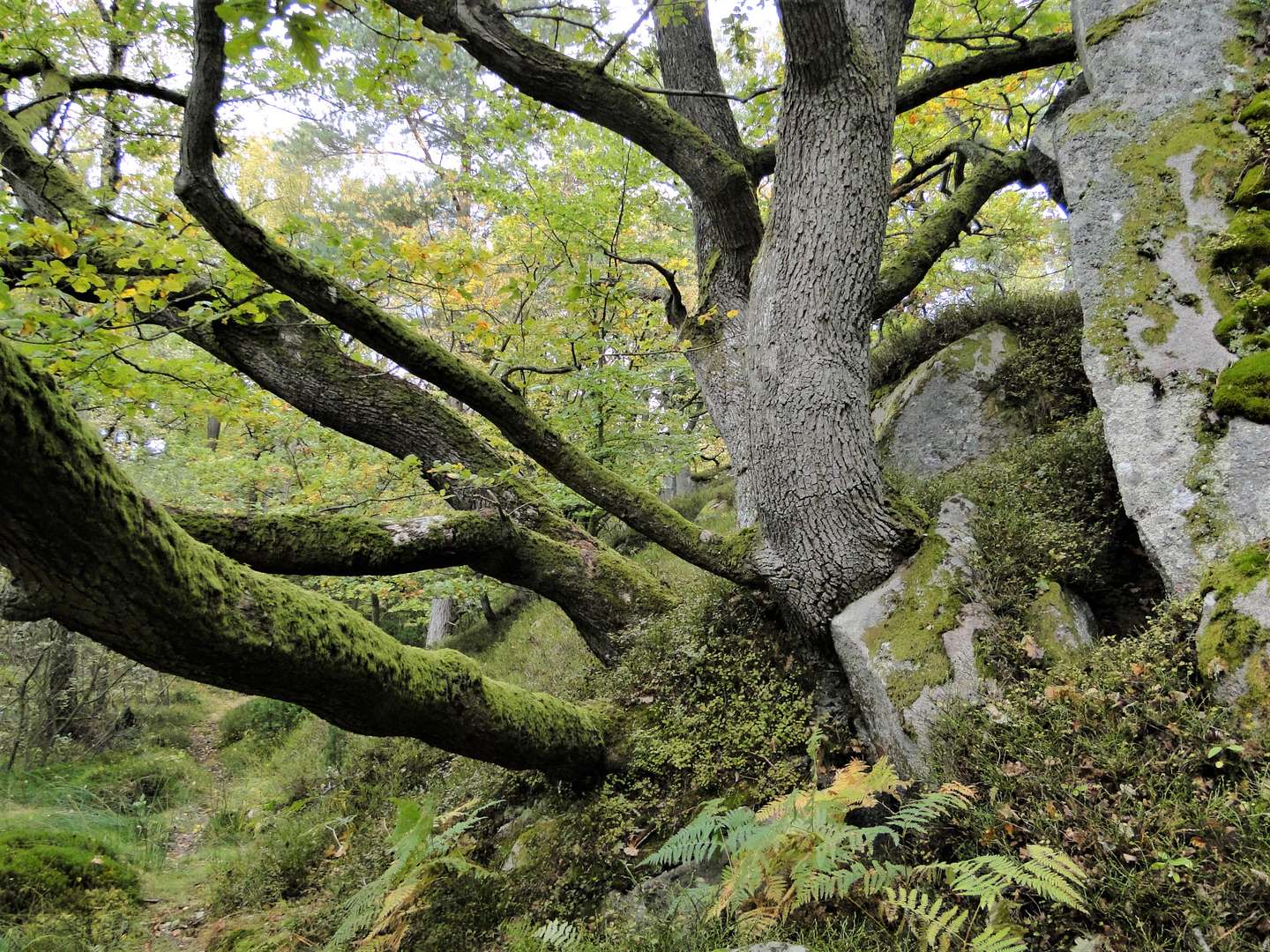 De valgte næsten altid en tur til gederne i Slotslyngen. I dag er de blevet voksne og har selv fået børn. Vores børnebørn synes også, at den samme tur er spændende. Denne artikel handler ikke kun om geder og får, vi skal også opleve en rigtig naturperle. En lille smuk mose med navnet Komyr, omgivet af store klipper og gamle krogede egetræer. Derefter følges stien gennem naturskoven til et mærkeligt egetræ med mange stammer. Det kaldes for ”Paraplyegen”, da træets mange stammer ligner stiverne på en paraply. Ude ved klippekysten skal vi se Mulekleven, et rigtig fuglefjeld med alke og lomvier, samt en ubeskrivelig flot udsigt mod Hammershus.