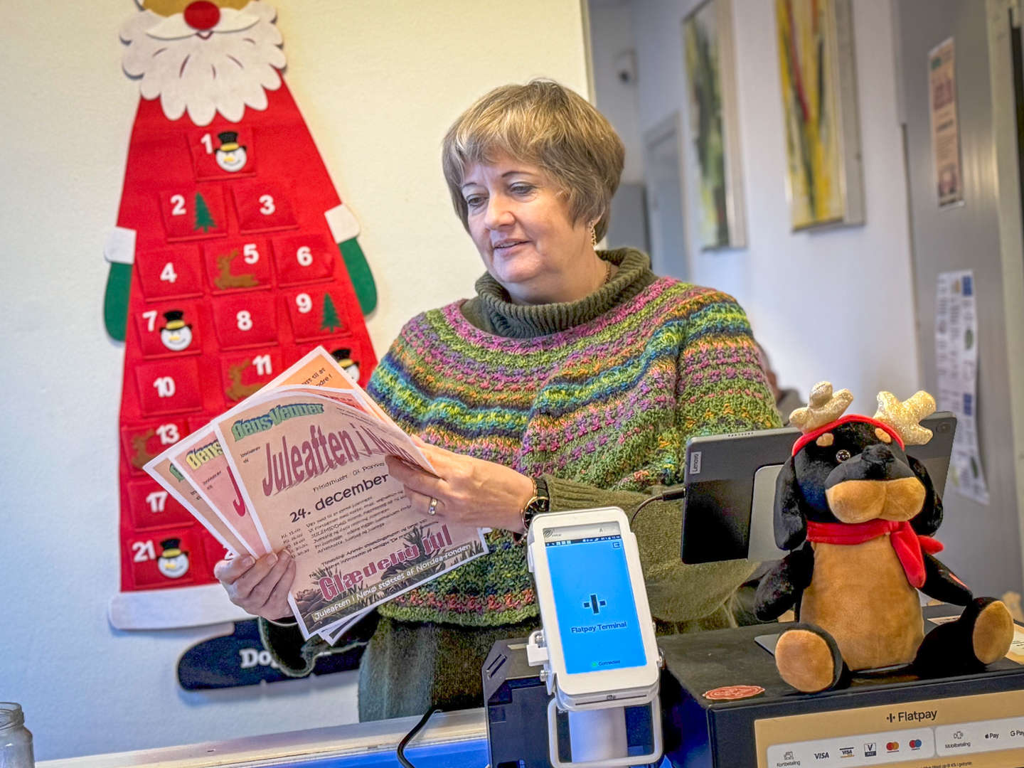 Billede fra sidste år, da Birthe Julin modtog tilmeldinger til årets juleaftensfejring fra sin plads bag kassen i Hundekunsten. Nu har hun og gemalen dog solgt butikken. Arkivfoto: Sarah Thun Kristensen