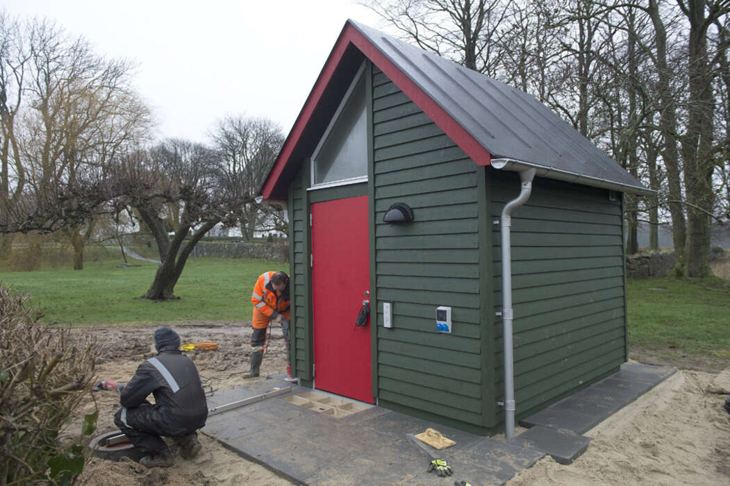 En servicebygning er i realiteten bare et toilet med puslebord og indlagt drikkeegnet vand, samt stik til opladning af cykler, tablets, telefoner eller andet.