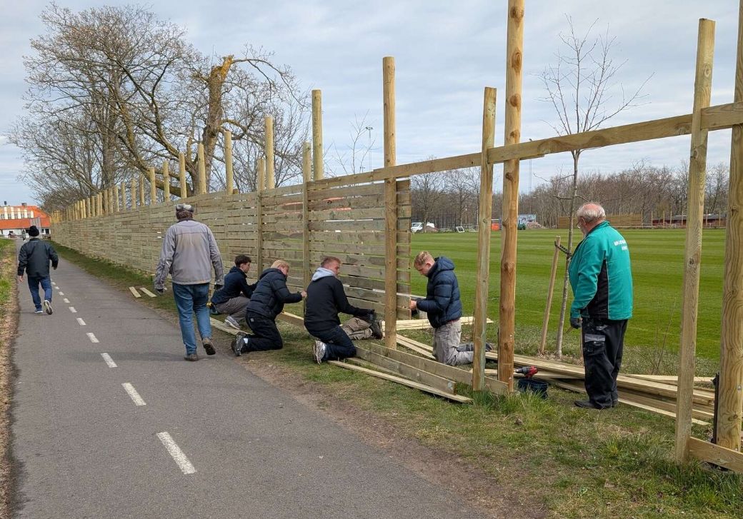 Søndagsfriske frivillige fra Svaneke Idrætsforening brugte søndagen på at sætte et nyt hegn op ved S...