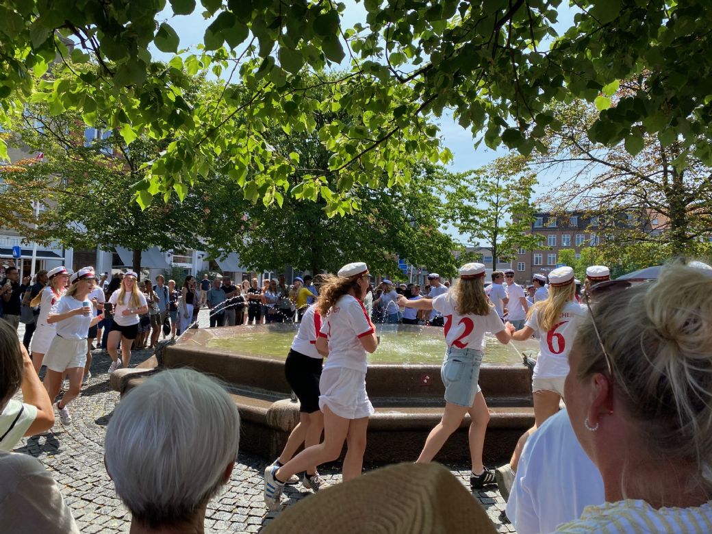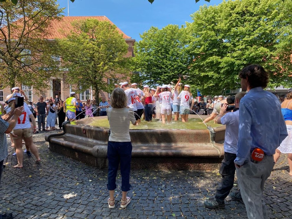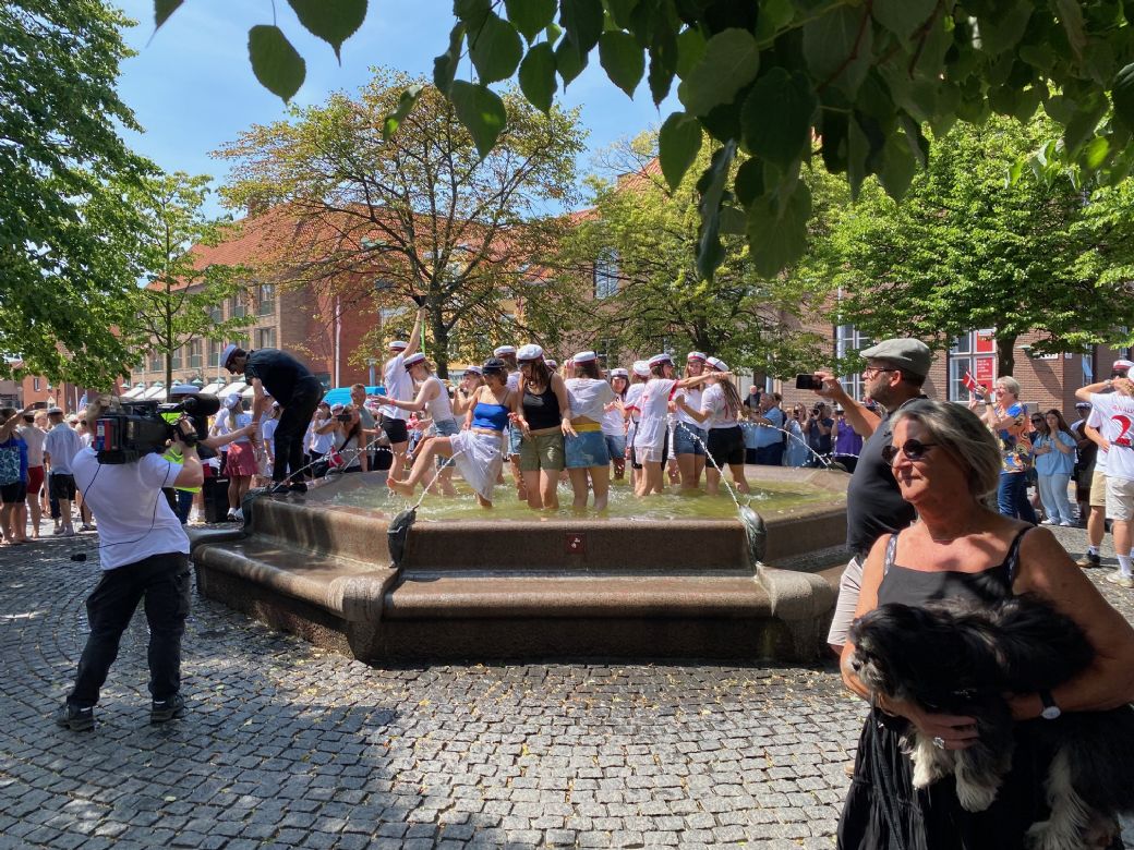 Der var nok flere, der godt kunne bruge lidt nedkøling i varmen, men i dag var det studenternes springvand. Foto: Dorthe Andersen