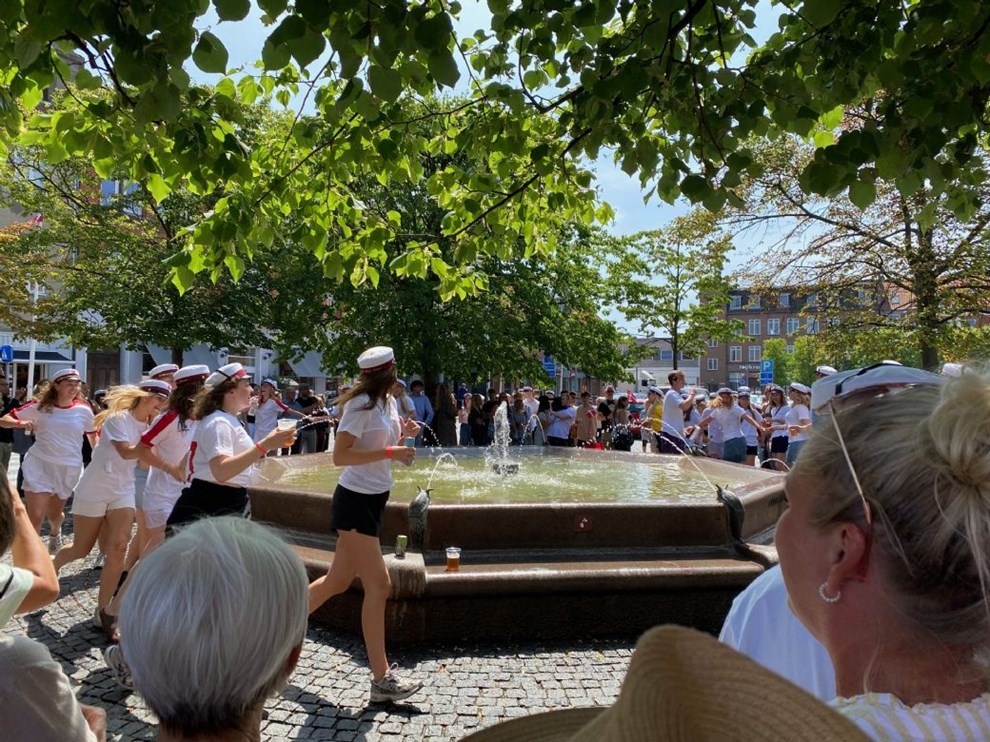 Det er muligt, at Tidendes reporter står alene med den længsel efter fortiden, men det tiltrak da i hvert fald publikum, da de nyudklækkede studenter traditionen tro indtog springvandet på torvet.