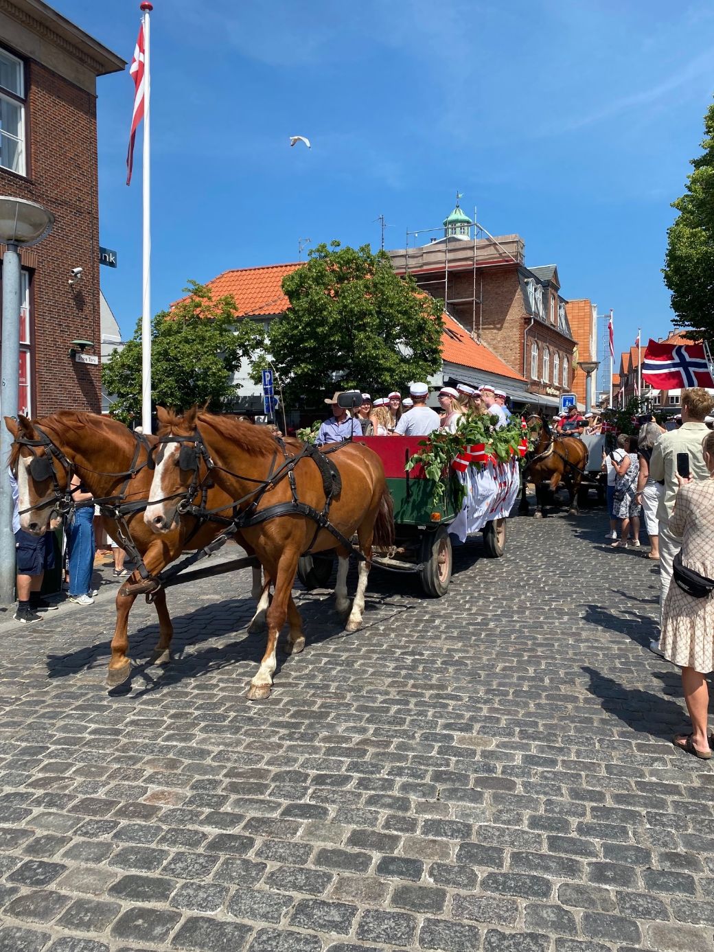 Store Torv i Rønne blev torsdag overtaget af hestevogne fyldt med lykkelige nye studenter.