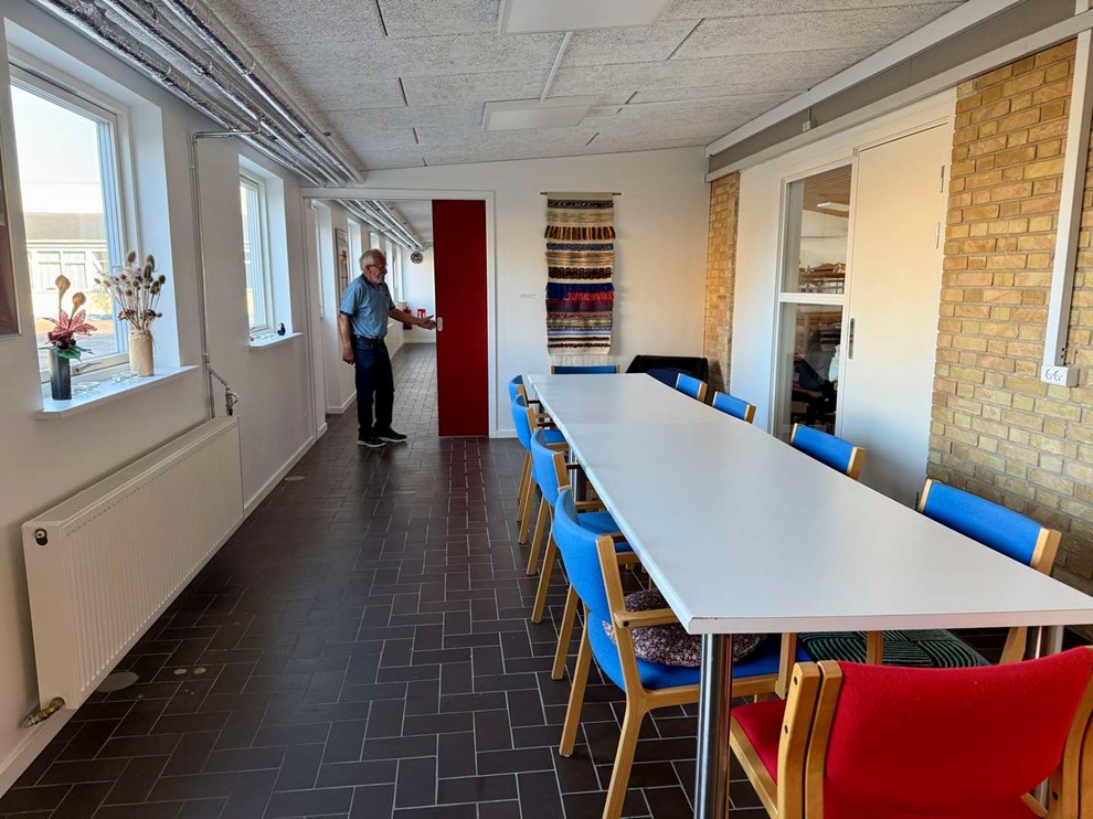 Vævedamerne har et stort lokale med 12 væve, arkivet har et lokale, og så er der tre mødelokaler. To af dem er ude på gangen, hvor en skydedør kan trækkes for, så der sagtens kan holdes to møder/aktiviteter samtidig.