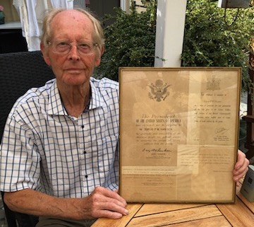 Sofus Hansen modtog takkeskrivelser både fra USA og fra England. De blev rammet ind og hang ved skrivebordet, lidt diskret. Sønnerne Ernst og Kaj har sørget for, at de indgår i bornholmernes historie ved at overdrage dem til Forsvarsmuseet i Rønne. Sønnen Kaj Hansen præsenterer her det indrammede billede.