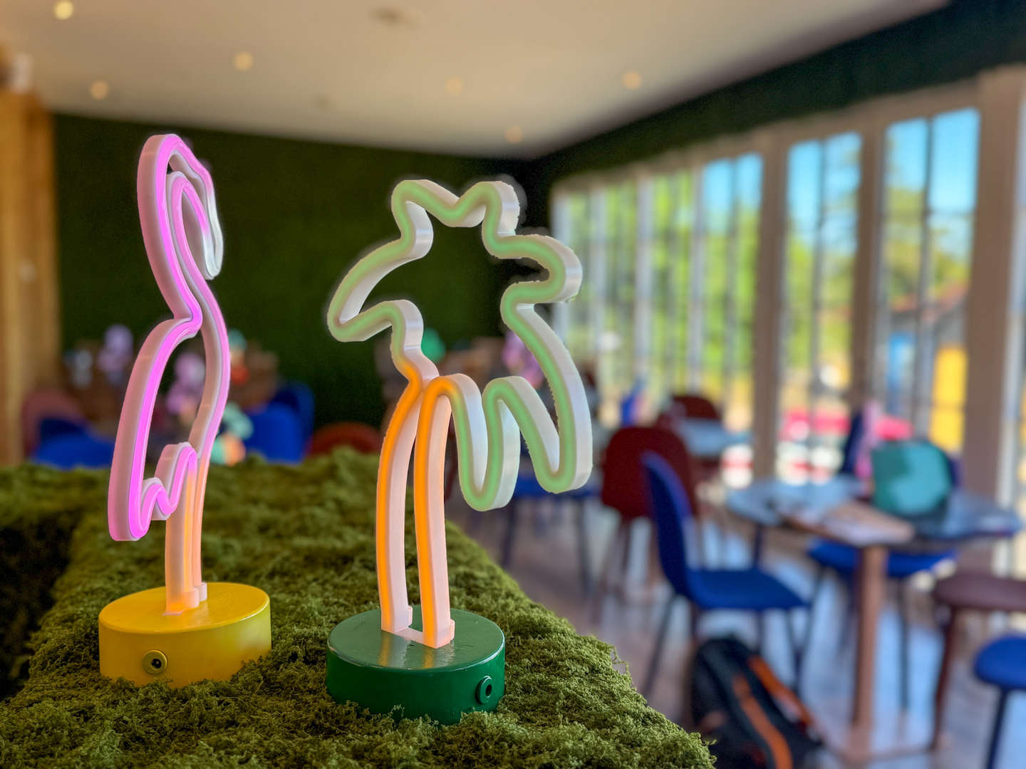 Her prydes væggene af festligt tapet med flamingoer, baren og buffeten er håndsnedkereret og dækket med bambus og på alle borde står et neonlys formet som forskellige figurer.