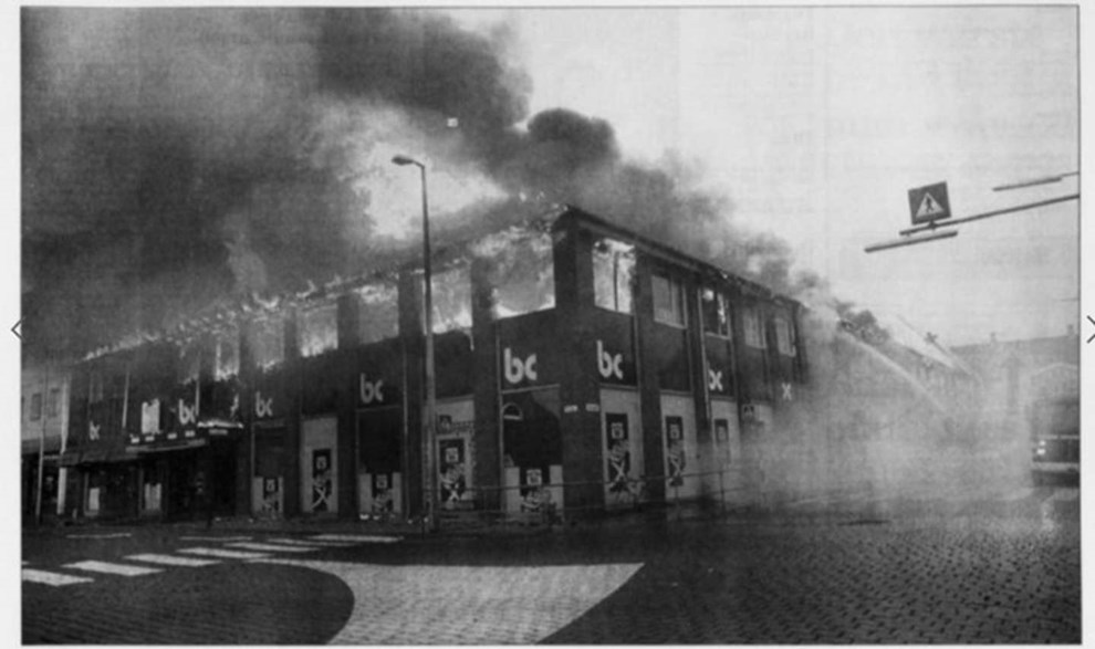 Branden, der skete den 24. oktober, udviklede sig hurtigt og i løbet af en time åd flammerne sig igennem tagetagen fra Sølvknappen over mod Favør (i dag Meny) og kontorlokalerne, mens blandt andet ilt- og gasflasker eksploderede med voldsomme brag. En episode, som Susanne Wridt selv oplevede på tæt hold, da hun dengang arbejdede i Favør. Og der i 2023 opstod en brand mellem den tidligere Colbergs Boghandel og Bornholmercentret, fremkaldte det associationer til netop oplevelsen fra 1994.