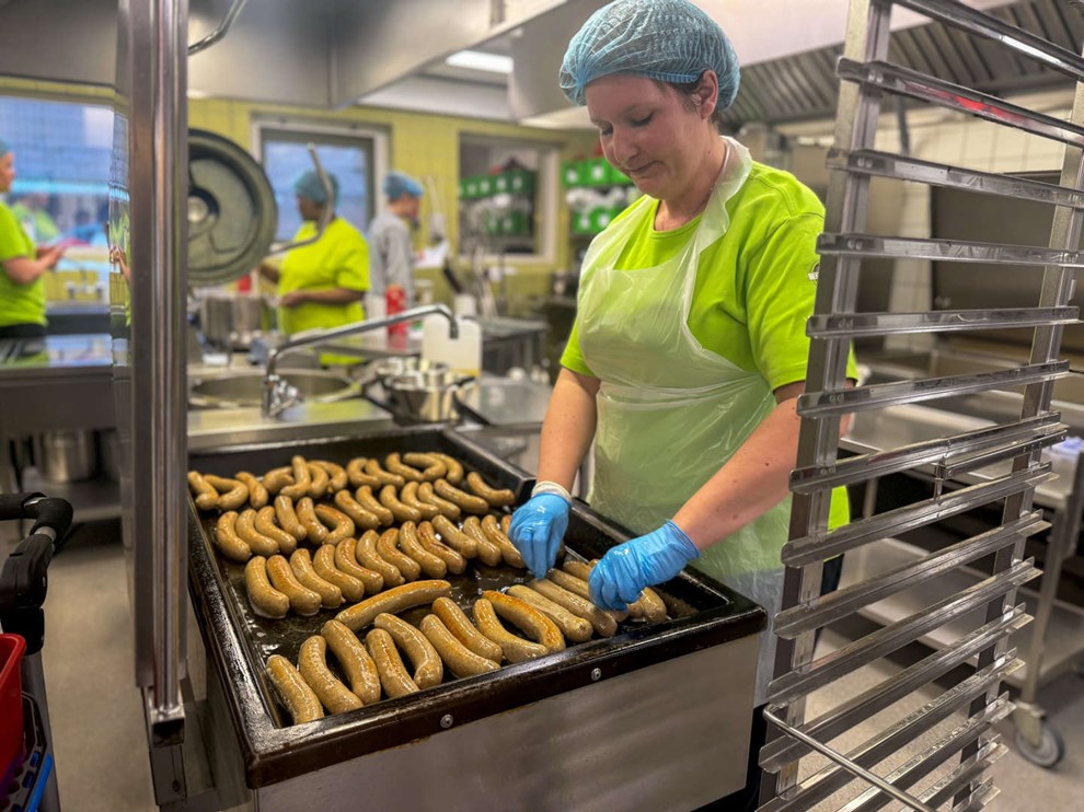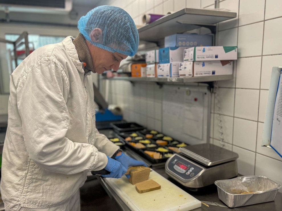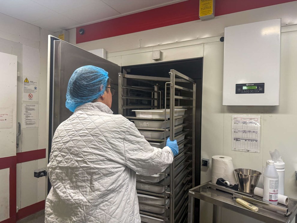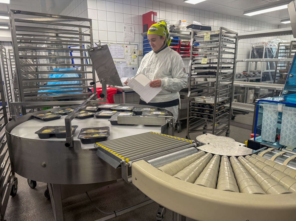 Maden pakkes i enten store bakker til plejecentre og kantiner, eller i små portionsbakker til de omkring 220 hjemmeboende pensionister, der modtager mad hver uge.