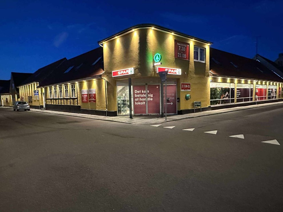 Når mørket falder på, lyser Spar-butikken hele Jernbanegade op. Eget foto.