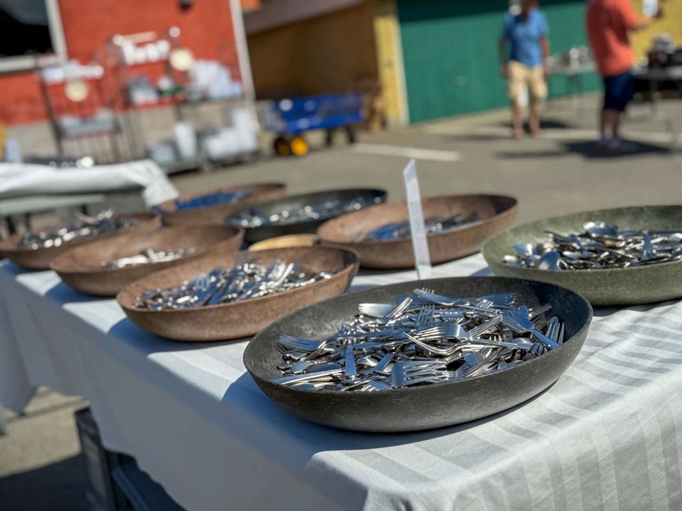 Udover gryder og stegepander kunne man på loppemarkedet også købe bestik. Foto: Jesper Gynther