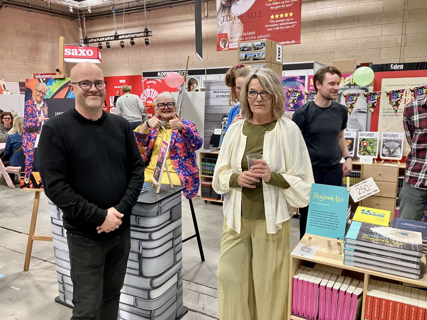 Direktør Klavs Holm sammen med grafisk designer og illustrator Engelke Toklum (th) på Hakon Holms stand ved Bogforum i Bella Center, København. I baggrunden vender Janne Høgshøj tommelen op, idet hun havde taget sin nye bog "JanneLoven", som giver en fuckfinger til Janteloven, med. Foto: Torben Østergaard Møller