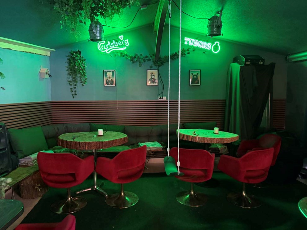 Dennis Theilgaard har en stor forkærlighed for vintage og genbrug. Han har selv bygget baren, tapetseret og sat paneler på væggene. De komfortable røde loungestole i velour er doneret af Slægtsgården. Sofie beskriver samarbejdspartneren som en slags alt-mulig-mand, der blandt andet kører et økologisk hobbylandbrug på Bakkely i Gudhjem.
