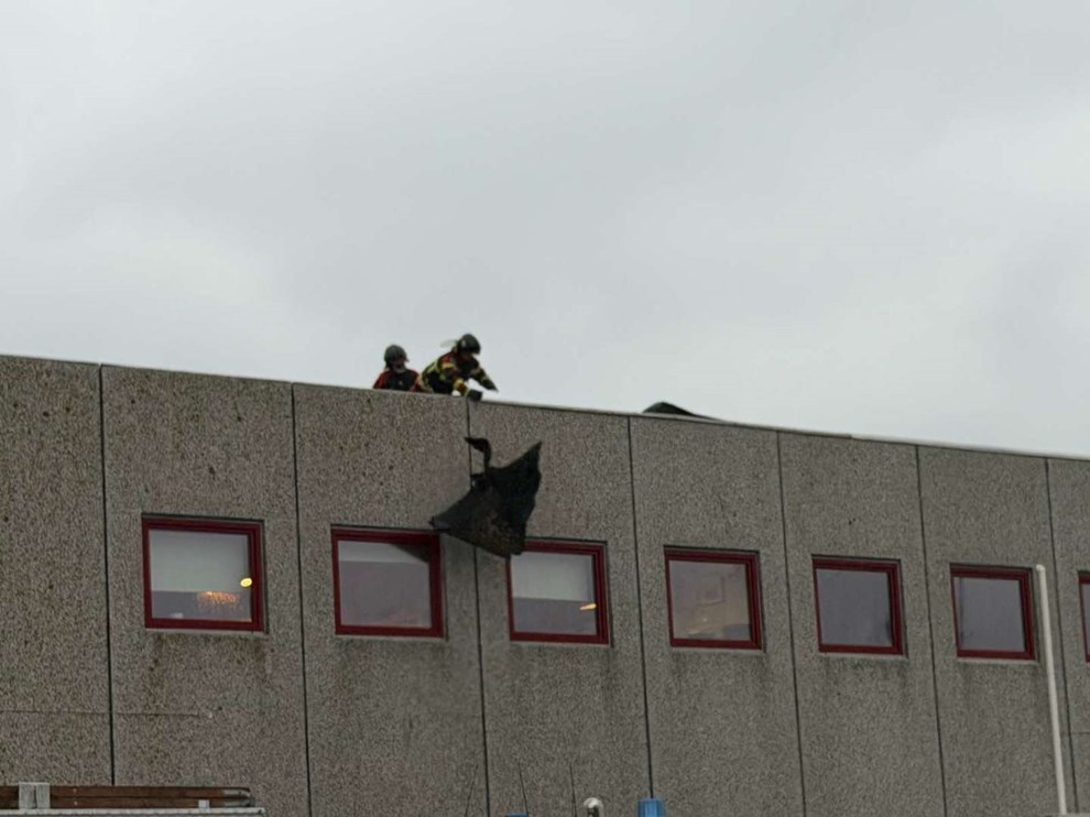 Ved hjælp af en stigevogn kom et par mand op på taget, hvor de sørgede for, at den løse tagpap kom ned på jorden på en sikker måde – i stedet for at rive sig løs og potentielt ramme en forbipasserende.
