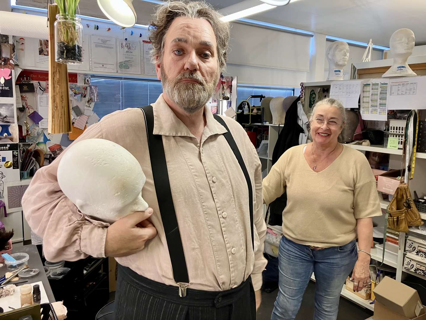 – Nu ta'r jeg hovedet under armen, siger Niels Jørgen Riis spøgefuldt, inden han med ny sminke på haster videre mod dagens næste opera.