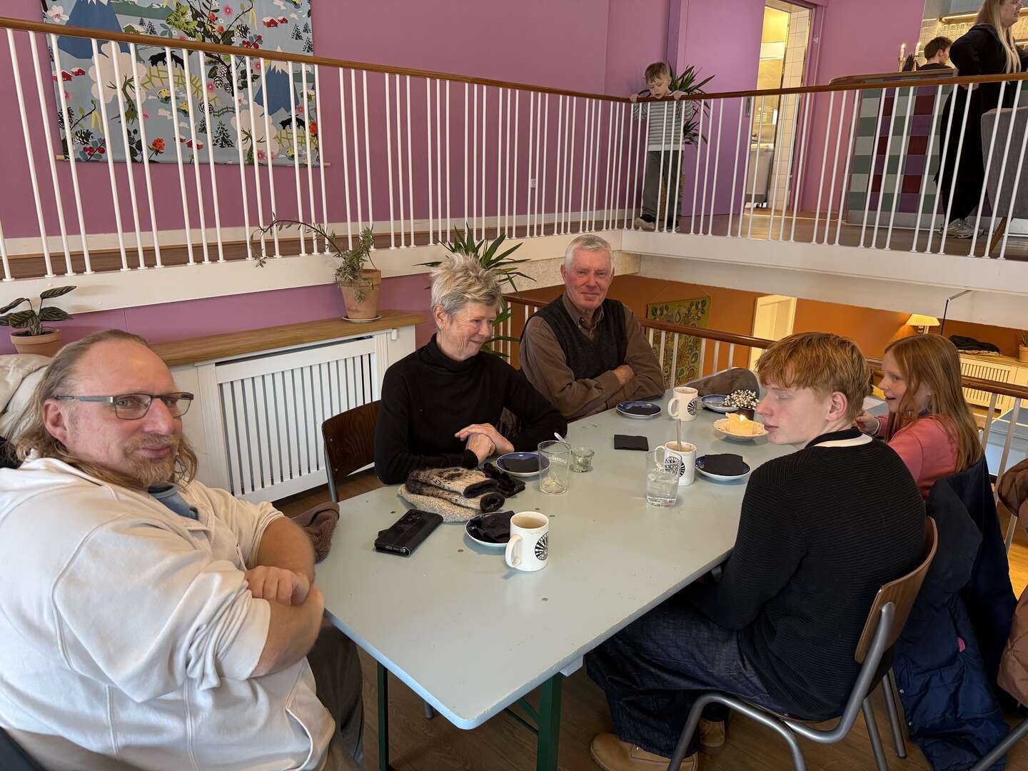 Kasper Munch Julin med sine to børn, Bjørn Emil Julin og Kamille Emilie Julin. Over for børnene sidder Merete og Carsten. Foto: Frida Flinch
