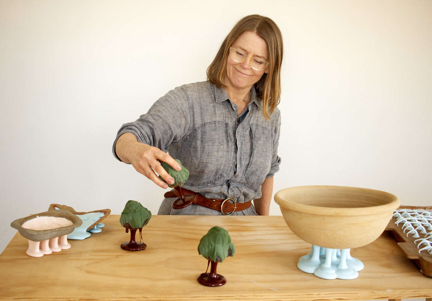 – Jeg tror helt sikkert, at det sjove udtryk er noget, der tiltaler mig. Det behøver ikke at være så ’pænt’ og alvorligt, og så kan jeg også godt lide, at det nogle gange ligner noget, der er flydende, og noget der måske har referencer til konditorarbejde, og hvis folk selv tror, at det er rigtig kageglasur, så bliver jeg faktisk lidt stolt, smiler hun.