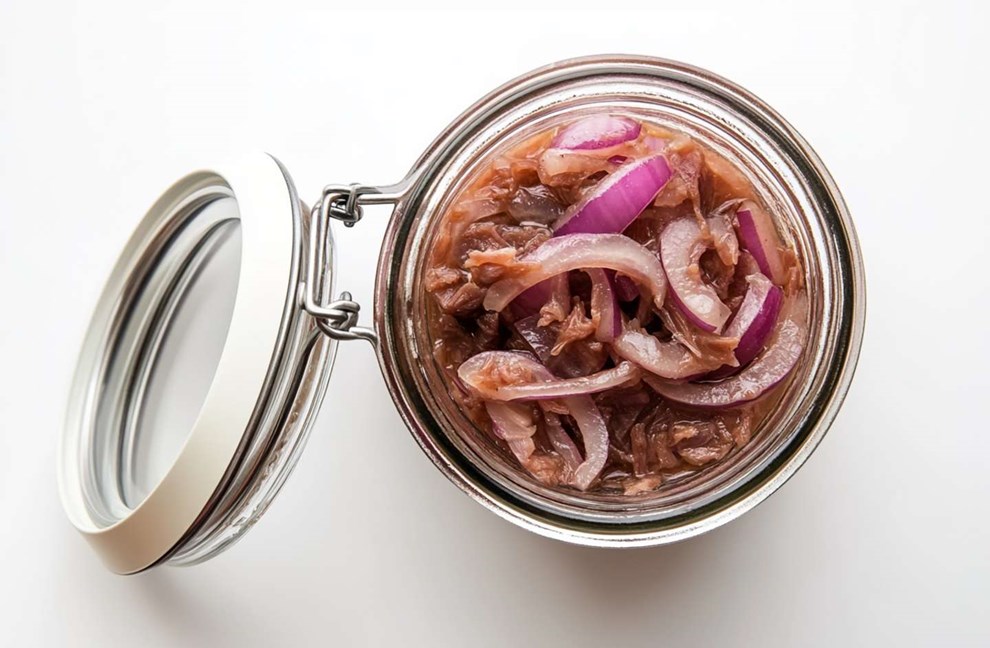 Næste glas, der skal fyldes, er det til løgmarmelade. Det lyder måske lidt underligt for nogle mennesker, men det er virkelig en lækker ting, der kan bruges som tilbehør til alt lige fra den stegte fisk, sandwich, i den burger, som du hævder, at du er bedst til at lave, eller måske som tilbehør til en lækker ost.