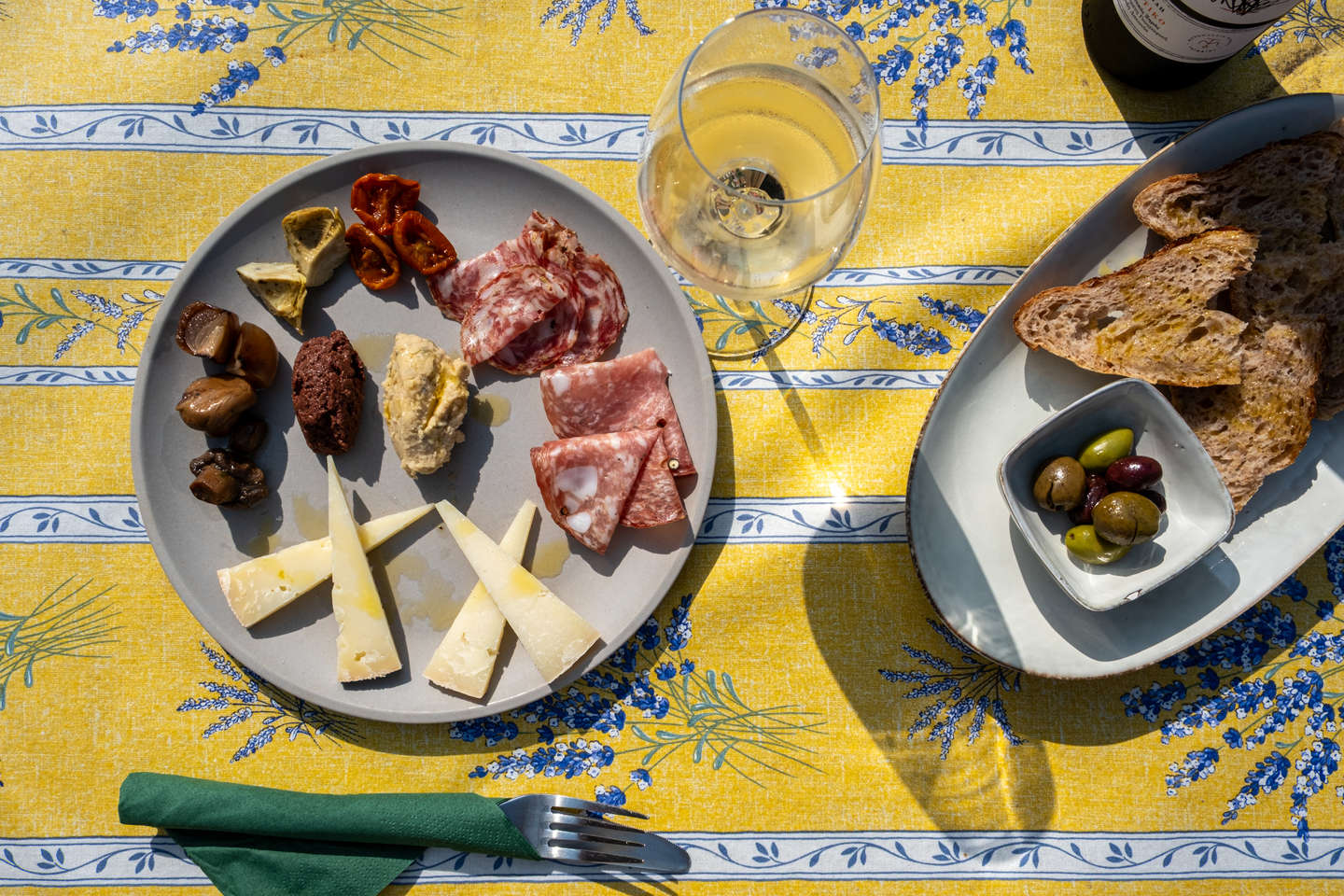 Nogle gange er det lidt lækkert at være aviskok. Simikka lavede nemlig en tapastallerken til mig med fenikkelpølse, hvidløgspølse, soltørrede tomater (eller bagte som i sidste uge), artiskok og marinerede svampe, selvfølgelig oliven, godt brød, tapenade og mos af butterbeans, olivenolie og kapers. Ahhh, aviskok, glem ikke pecorinoost og den gode spanske ost…