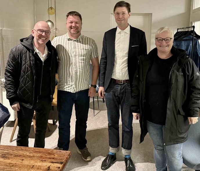 Natteravnene kan snart flytte ind i nye lokaler på Bornholms Tidende. Her er tre bestyrelsesmedlemmer Klaus Elleby Larsen, René Gundvang Nielsen og Jeanette Due Hansen sammen med Kristoffer Gravgaard (nummer to fra højre) fra Tidende. Foto: Natteravnene Bornholm