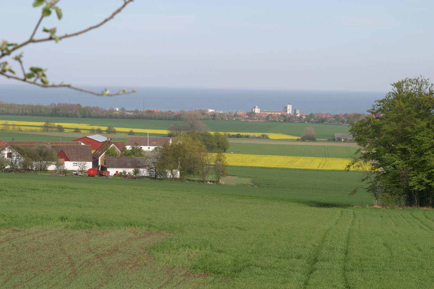 Derefter køres retur til Rønne. Stop ved busholdepladsen og kig ned mod Rønne. Der ligger øens største by på en lav slette med sine huse, siloer, kirketårne og andet.
