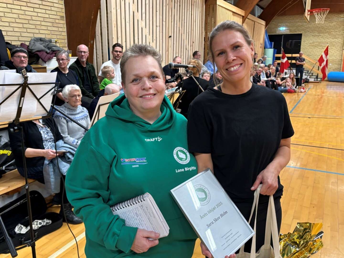 Kåringen af Årets KIF’er og Årets Ildsjæl foregik i år i forbindelse med den årlige gymnastikopvisning i hallen, hvor Lone Kristoffersen på vegne af forretningsudvalget hyldede de to modtagere – Tommy Andersen og Sarah Skov Holm, der begge er aktive i gymnastikafdelingen. Foto: Kjeld Lundbæk