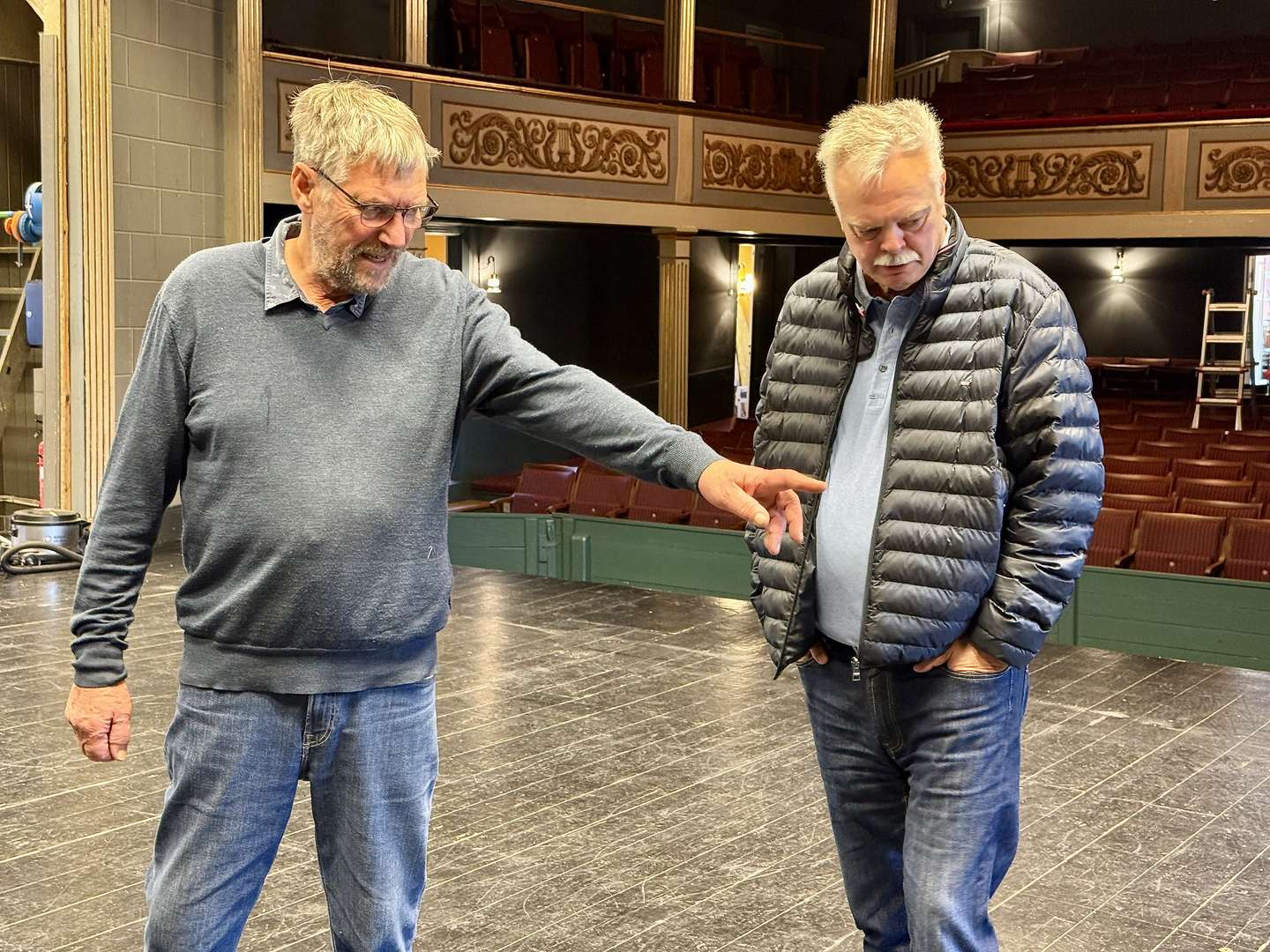 Jens Olsen fremviser nogle af renoveringens detaljer for Bjarne Hansen, formand for Rønne Theaters Venneforening. Foto: Holger Larsen