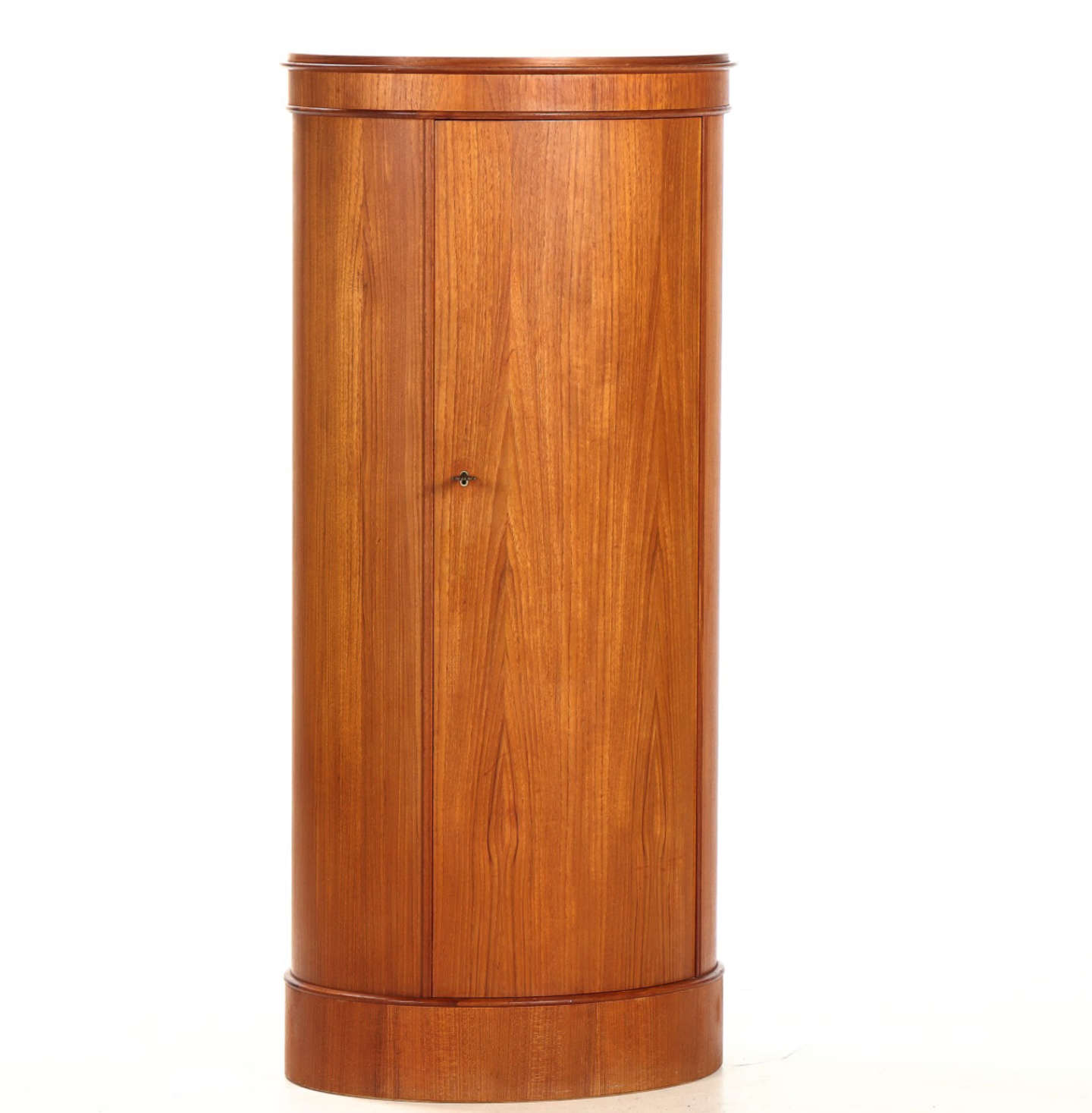 Lauritz.com, som efter konkursen er genskabt af Auktionshuset i Hørsholm, sælger et nyrenoveret, ovalt piedestalskab af fineret teaktræ. Det er tegnet af Johannes Sorth og fremstillet hos Bornholms Møbelfabrik i 1960'erne. Mindstebuddet på 7.000 kroner er opnået – auktionen udløber lørdag aften. Vurderingen er sat til 9.400 kroner.