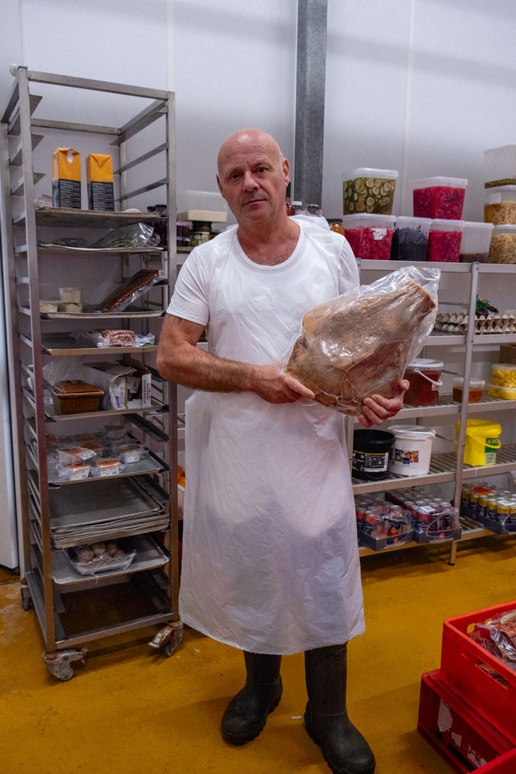 – Og så er der “Holms den gamle", også kaldet "Saltet Satan". Jørgen sagde, den var lavet af halvt salt og halvt gammel gris. Det passer så ikke. Den er lavet af helt frisk gris. Den skal hænge i tre måneder, og man får et fantastisk produkt. Det er virkelig en favorit.