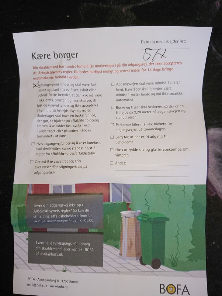– Når vi ser på, hvor mange henvendelser, vi får, og hvor mange breve, der er delt ud, så kan vi konstatere, at langt, langt de fleste borgere gerne vil hjælpe og også er med på at finde løsninger i mindelighed, typisk ved for eksempel lige at flytte deres beholder nogle meter den ene eller den anden vej. Men dertil er der en mindre gruppe, hvor der kan være forskellige problemer. Et af problemerne kan være det her med, at der er folk, hvis problem ikke ligger på deres egen matrikel, og der er andre, som simpelthen er uenige i det, skraldemanden skriver, eller måske ikke forstår det, der står.