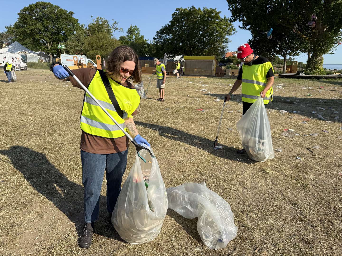 Med en plastikpose og en gribetang i hænderne går skraldeholdet mod cirkuspladsen, der aftenen før var propfyldt med glade mennesker, der skulle overvære paneldebat mellem partilederne eller høre bandet Aphaca spille koncert.
