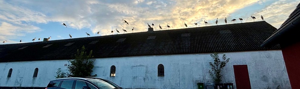 – Det var et fantastisk syn, som ventede os fredag aften, da vi kom hjem. Der sad cirka 60 storke på tagryggene på gårdens bygninger.