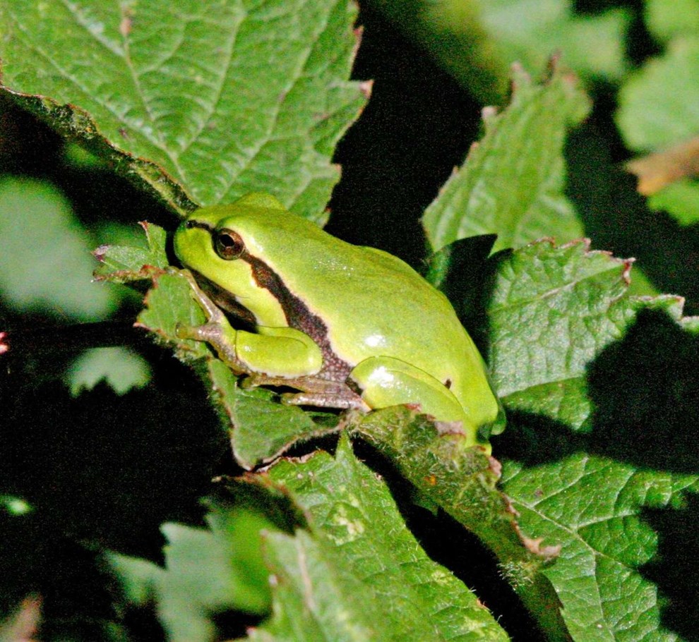 De små løvfrøer forlader ynglestedet i september, de følger ofte cykelvejenes grønne korridorer. Læg mærke til frøens sorte stribe, der fungerer som camouflage