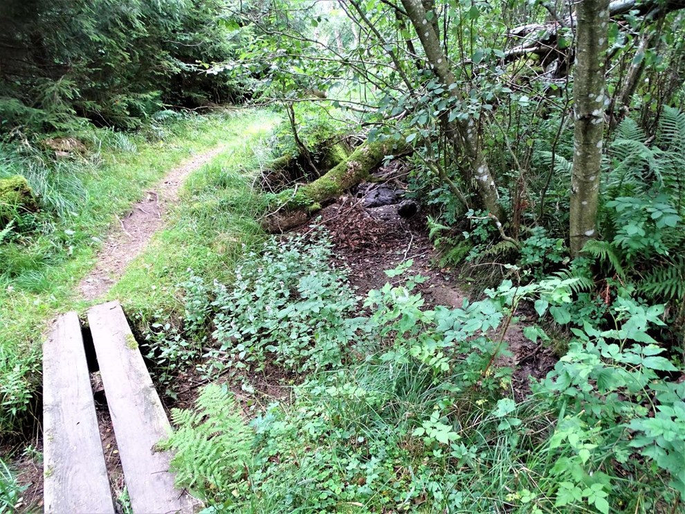 De smalle broer passeres en efter en, og kort efter kommer Grønnevad, hvor Højlyngstien fortsætter langs åen på den anden siden af broen. Vores rute følger til gengæld den gode vej gennem plantagen mod højre.