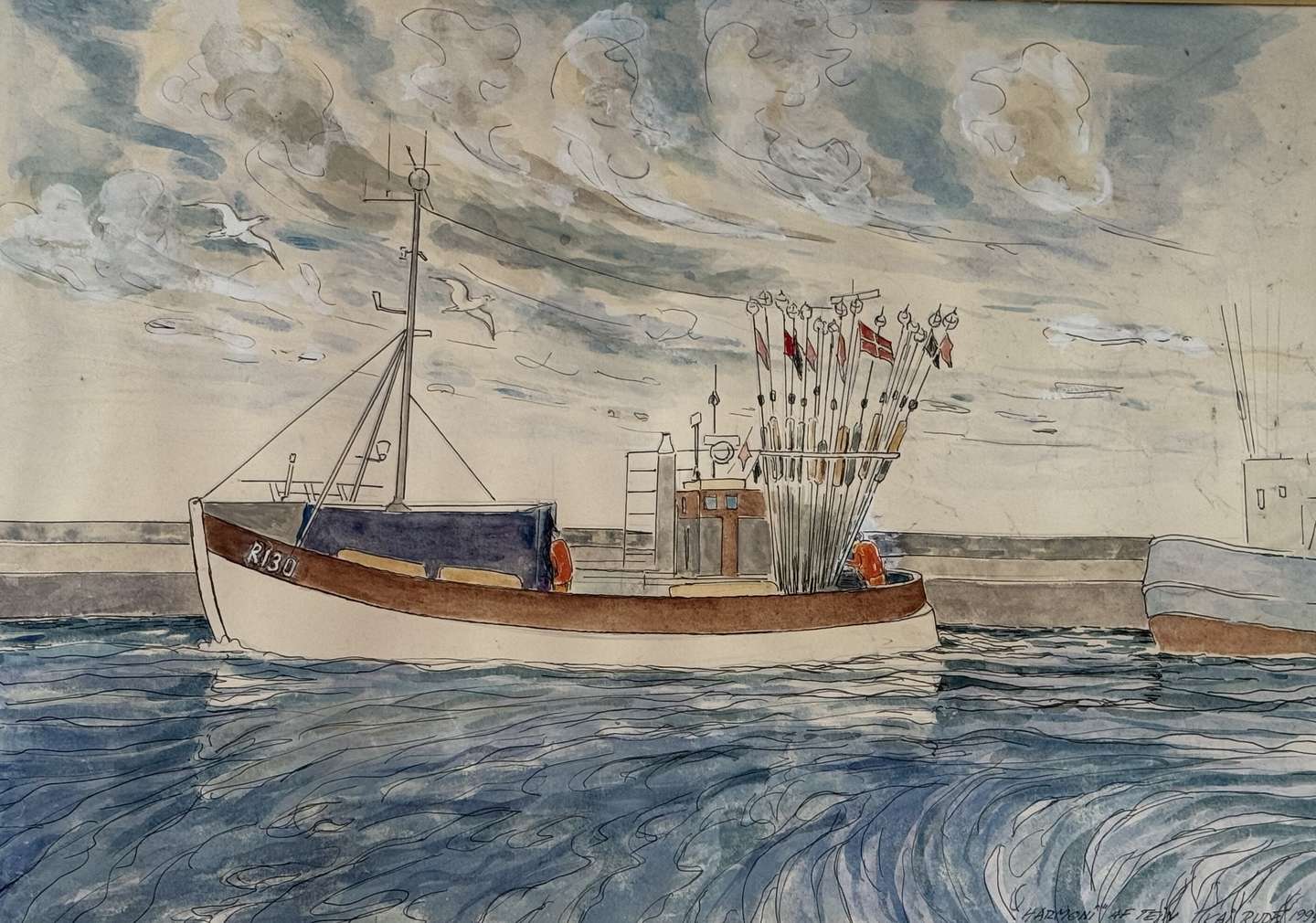 Ebbe Bay Mogensens kutter "Harmoni", som han og tre besætningsmedlemmer brugte til laksefiskeri, tegnet af Kai Rude. Foto: Holger Larsen