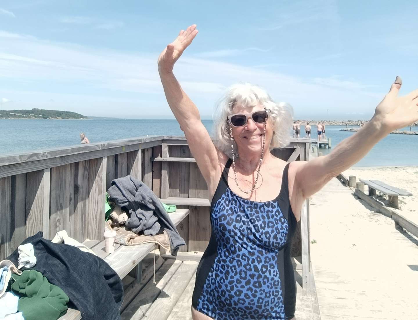 Knap en måned efter møder jeg igen Lis Koplev på præcis samme sted som den første gang: siddende på en bænk ved Nørrekås strand, med solhat, hvor hun iagttager sine omgivelser.