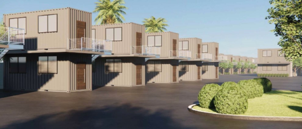 Helt op til 200 af de her små containerboliger kan skyde op på den grund i Rønne, der tidligere husede Bornholms Havemøbelcenter.