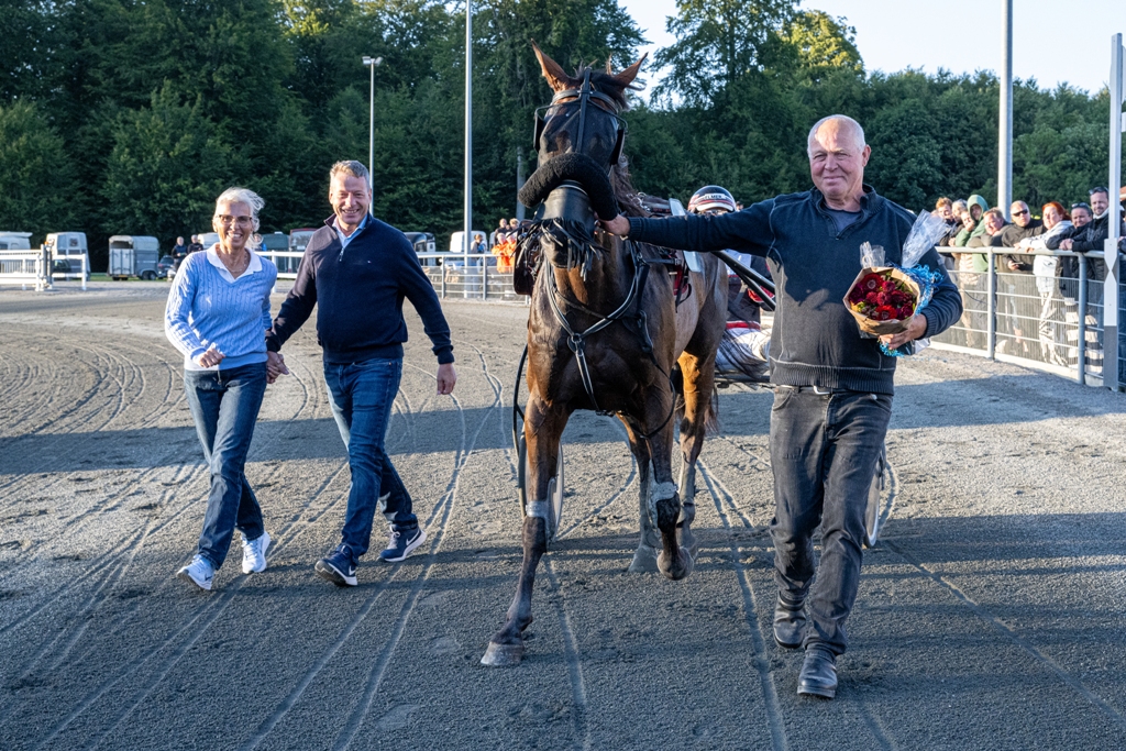 Frøns Hjortshøj vandt en imponerende sejr, da han for første gang stillede op i hurtigklassen. Her ses ejer og træner Kurt Pedersen med dagens helt på Bornholms Brand Park. Foto: Torben Ager