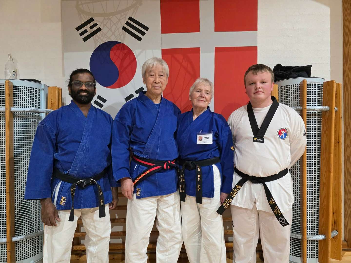 Jesper U. W. Olsen, Ko Tai Jeong, der er taekwondosportens øverste leder i Danmark, Lis Borring og Benjamin Nielsen ses her efter søndagens graduering på Bosei-centret ved Præstø. Eget foto